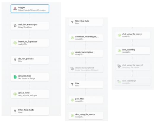 The first core module handled the ingestion and processing of sales calls. This started with retrieving the agent and call metadata from Supabase and PhoneBurner. After the calls had been located, recordings were passed through OpenAI’s Whisper for transcription.