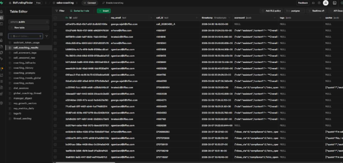 With accurate coaching data in hand, the next part of the system design was organizing and delivering it. For this, data was saved in Supabase using structured JSON formats that matched existing dashboard schemas. Coaching summaries were indexed with relevant metadata that included the call ID, agent, and tags. These summaries were optionally embedded as vectors for future semantic search and memory.